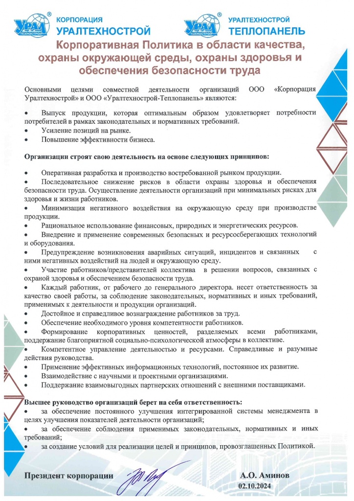 В ООО «Корпорация Уралтехнострой» и ООО «Уралтехнострой-Теплопанель» с декабря 2013 года функционирует корпоративная Интегрированная система менеджмента (ИСМ), включающая следующие системы менеджмента: систему менеджмента качества, систему экологического менеджмента и систему менеджмента охраны здоровья и обеспечения безопасности труда.